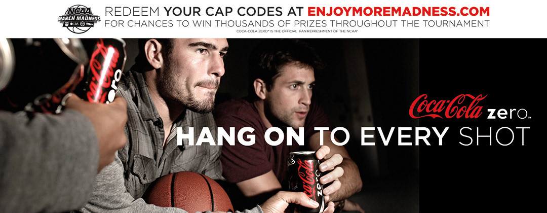 Key visual and selected in-store executions from Coca-Cola's "Enjoy More Madness" NCAA men's basketball tournament promotion.